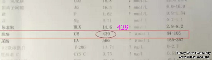 After only 15 days of Chinese medicine treatments, her creatinine level is reduced to 439umol/L from 557umol/L. Also her anemia and hyperuricemia is also relieved greatly.