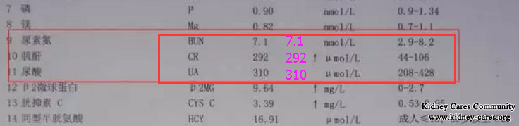 18 days later, serum creatinine level reduced to 98umol/L and moreover his heart is improved as well. The improvement of his heart is because Chinese medicines discharge toxins out of his body and the toxins do not attack his kidneys any more.
