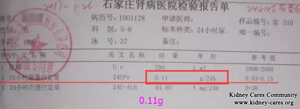 After 20 days of our Chinese medicine treatments, red spots gradually disappeared and 24h urine protein was also back to normal 0.11g. Of course, further treatment is necessary. As long as you insist on treatment to consolidate the effect, the therapeutic effect will be good.