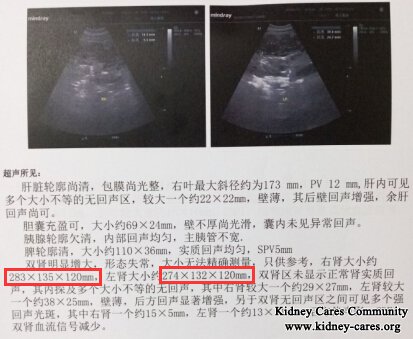 After 21 days’ treatment in our hospital, we can see that the right kidney shrink from 283*135*120mm to 275*132*114mm. Left kidney shrink from 274*132*120mm to 260*128*111mm. With treatment going on, cyst size gradually becomes small and then his kidney size will be reduced further.